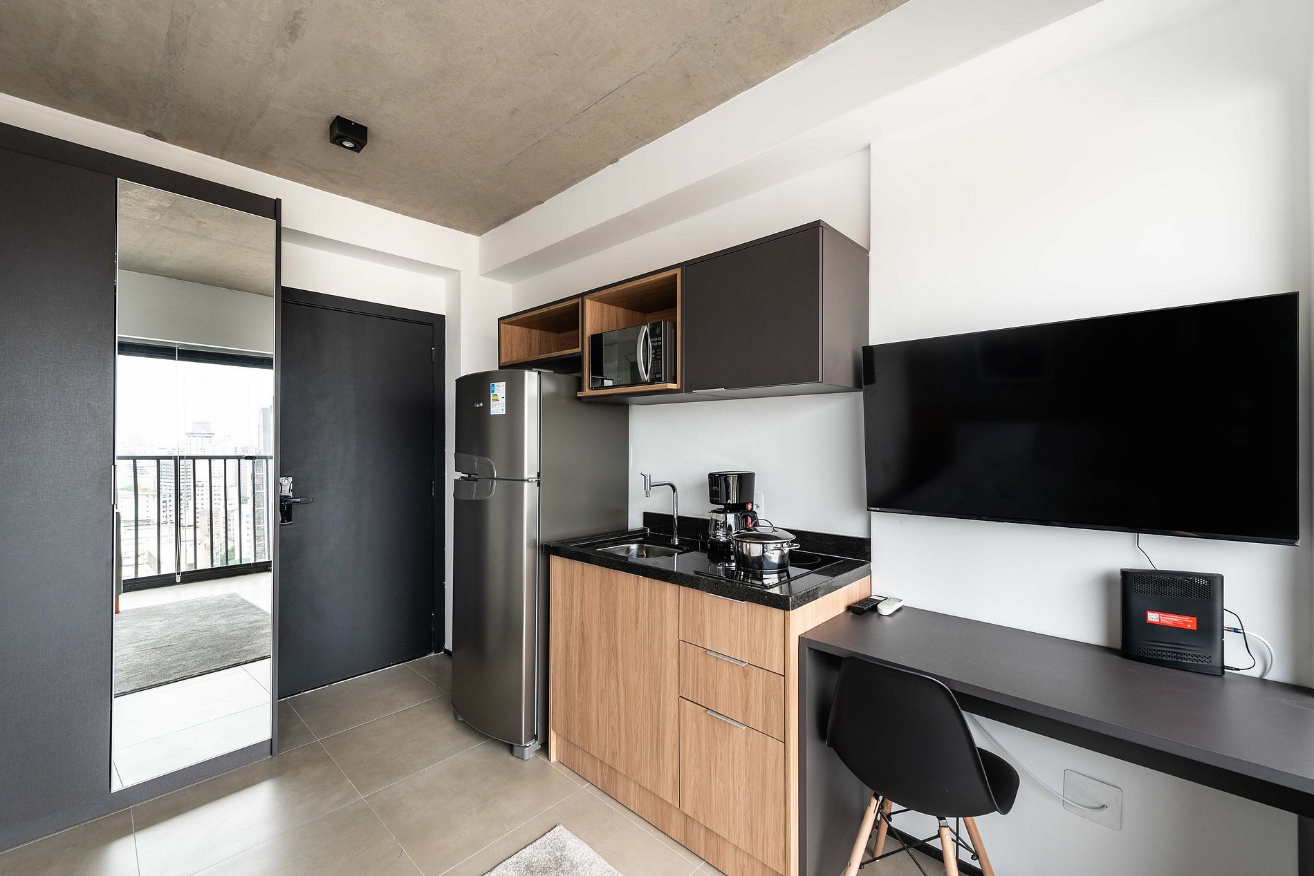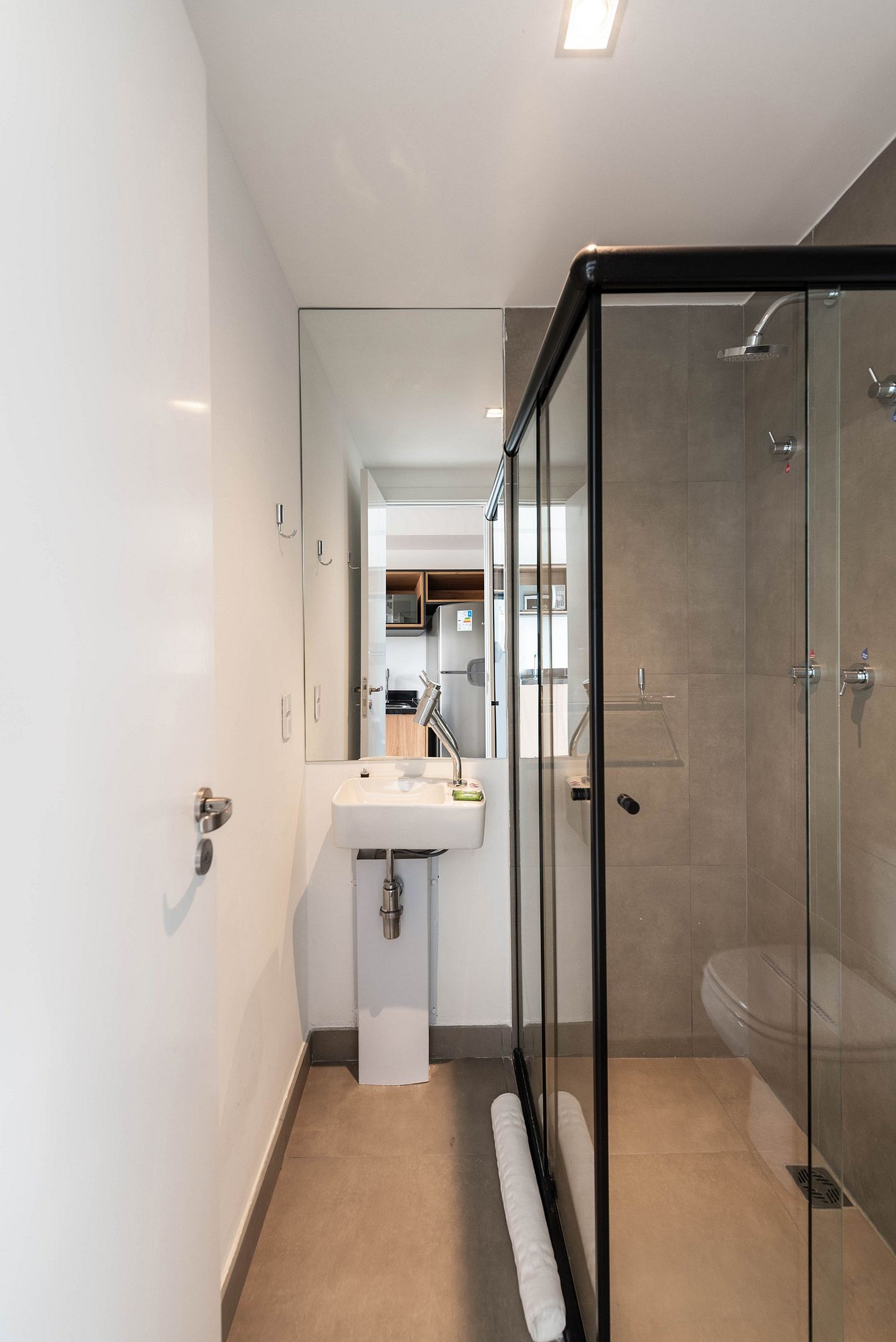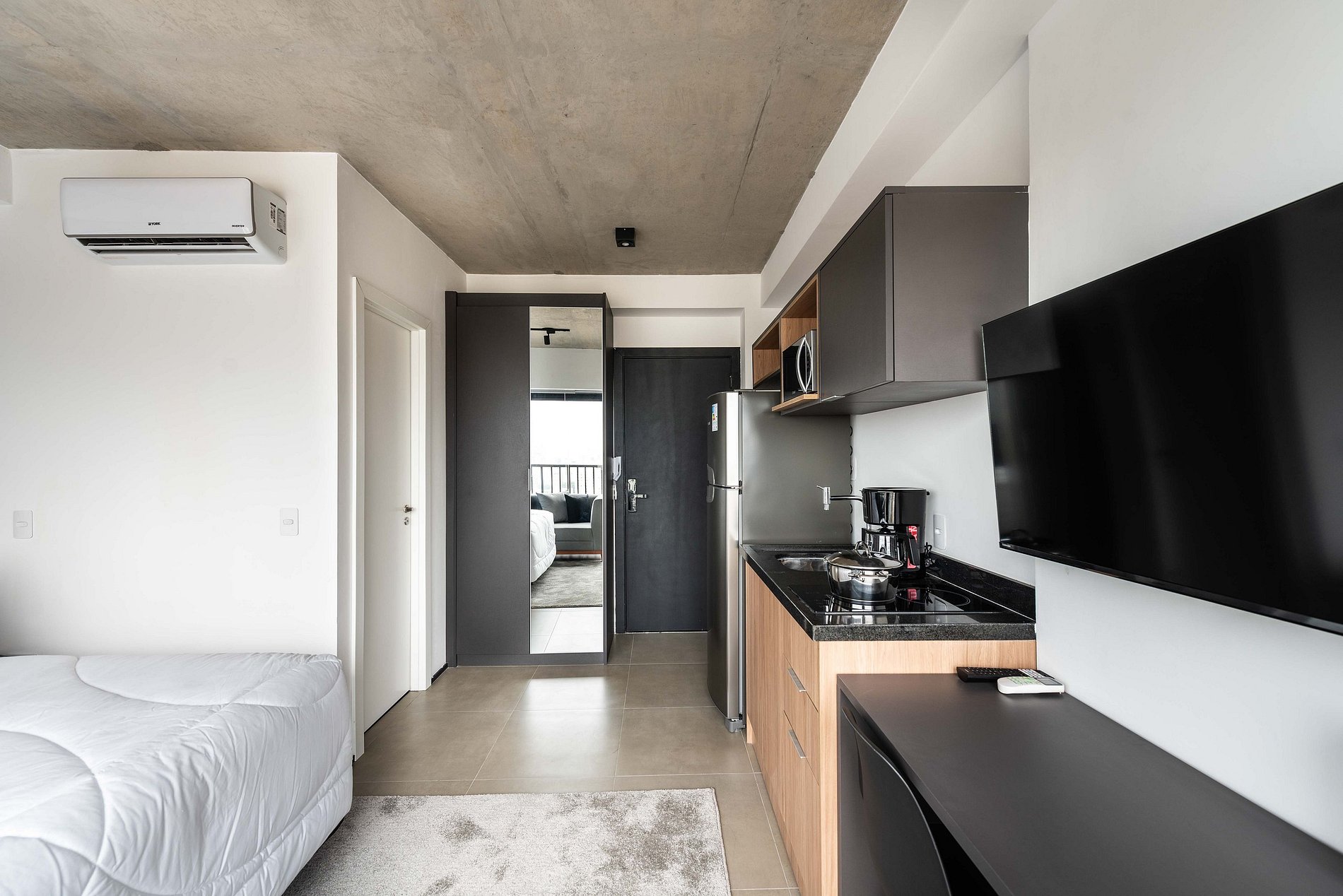 O Studio possui 25m2, e muito prático para atender as necessidades. Os hóspedes terão acesso livre a todas as áreas comuns do condomínio, exceto ao salão de festas. O condomínio possui lavanderia OMO compartilhada (valores à parte), Coworking, lounge, cozinha compartilhada, espaço PET.