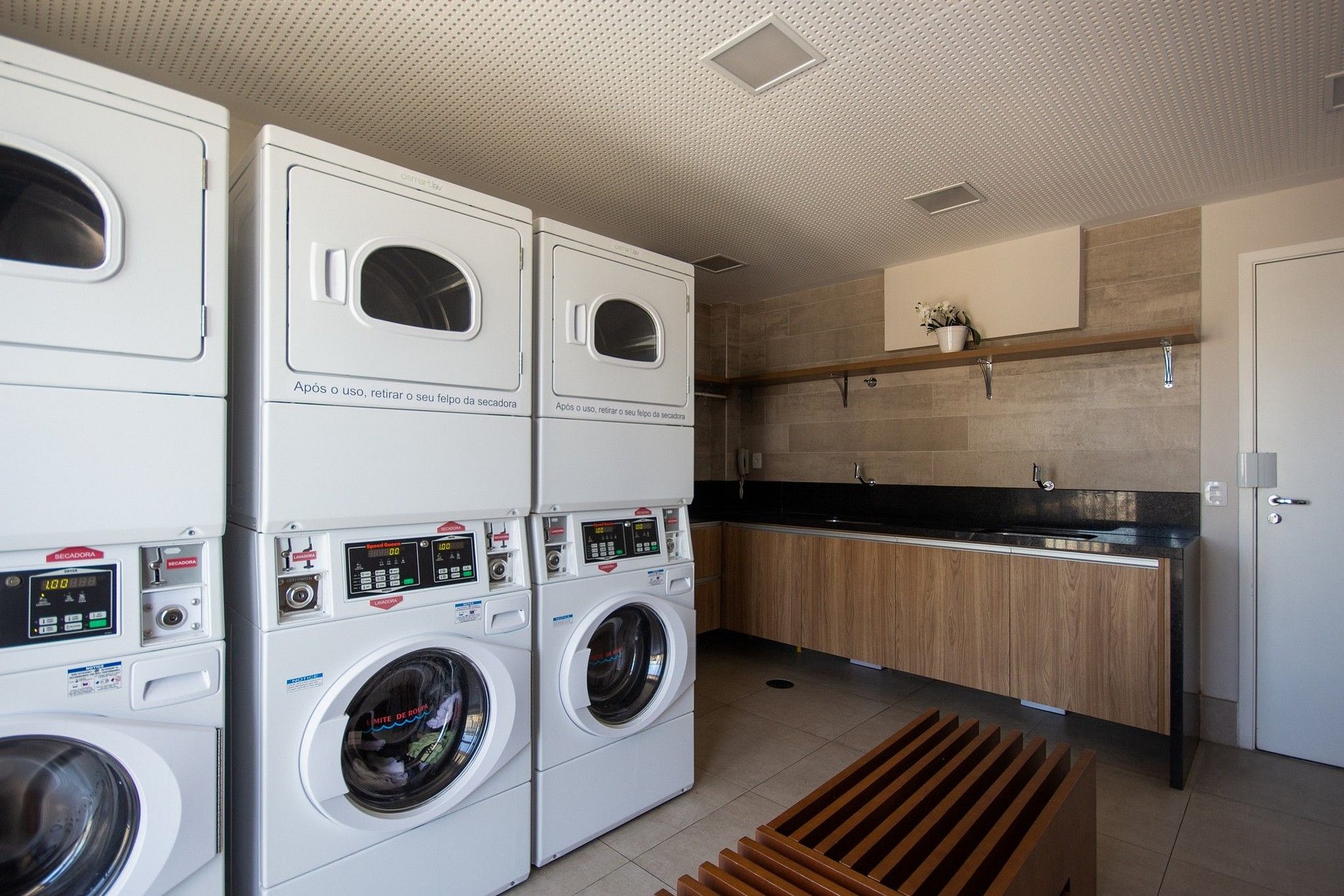 A lavanderia é da OMO, e caso faça utilização, só retirar a chave na portaria e baixar o Aplicativo para o pagamento do serviço.
