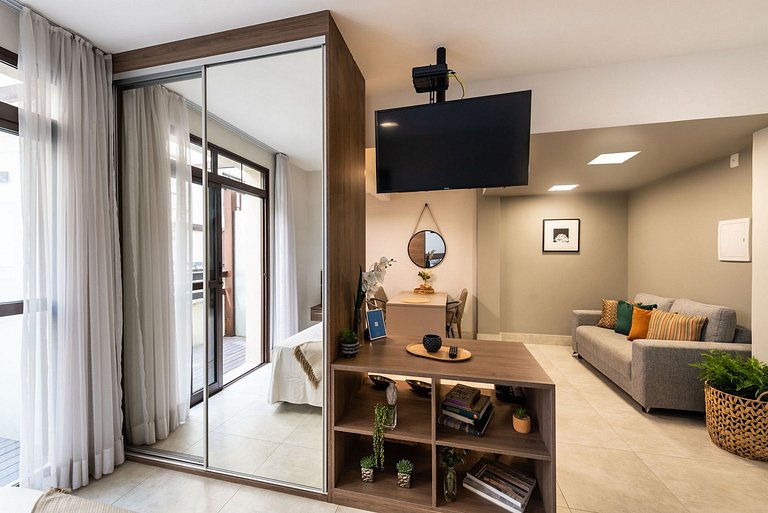 O Studio está localizado no 1º andar do Condomínio Jacques Pilon na Avenida Senador Queiros, primeiro retroart do Brasil. Situado no Centro de São Paulo. o espaço conta com uma varanda para relaxar, e bem aconchegante, seja para o lazer ou trabalho. O Wi-Fi tem ótimo desempenho, a TV é Smart TV 40", Ar condicionado, Frigobar, Cooktop, Microondas, Utensílios de cozinha, Máquina de Café Nespresso, Secador, Ferro e Tábua de passar.