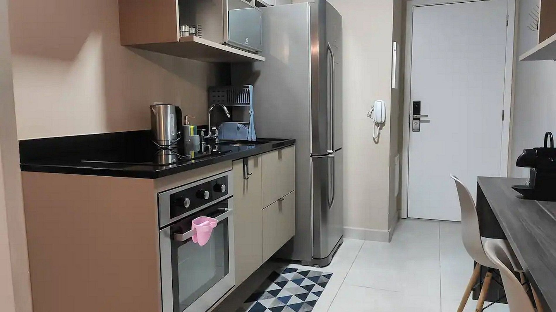 Cozinha: Utensílios completos e novos, cafeteira Nespresso, cafeteira normal, mixer, cooktop de indução com 4 pontos de cocção, forno elétrico embutido, panelas, assadeiras para o preparo de refeições, talheres, xícaras de café, copos, pratos, canecas, bowls.