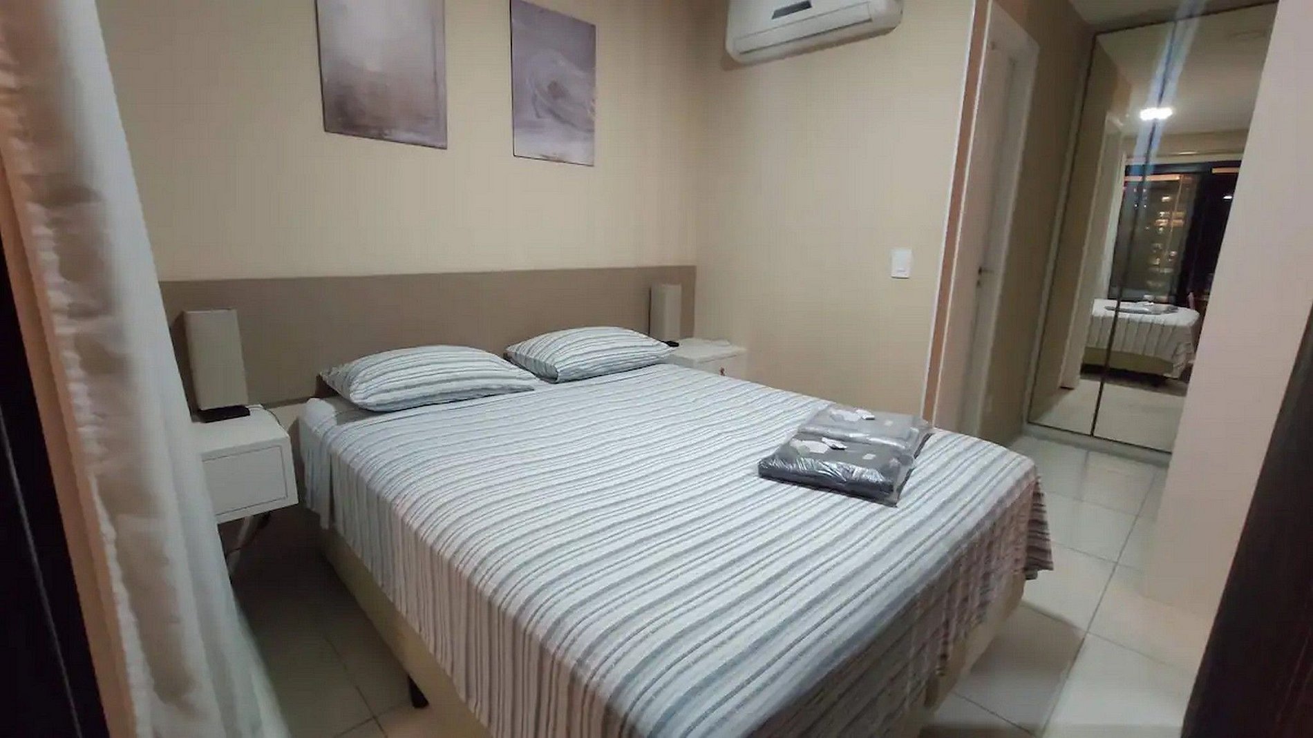 Suíte: Vidros duplos e com vedação Anti-ruído, Cama Queen, Ar-condicionado e mesas de cabeceira.