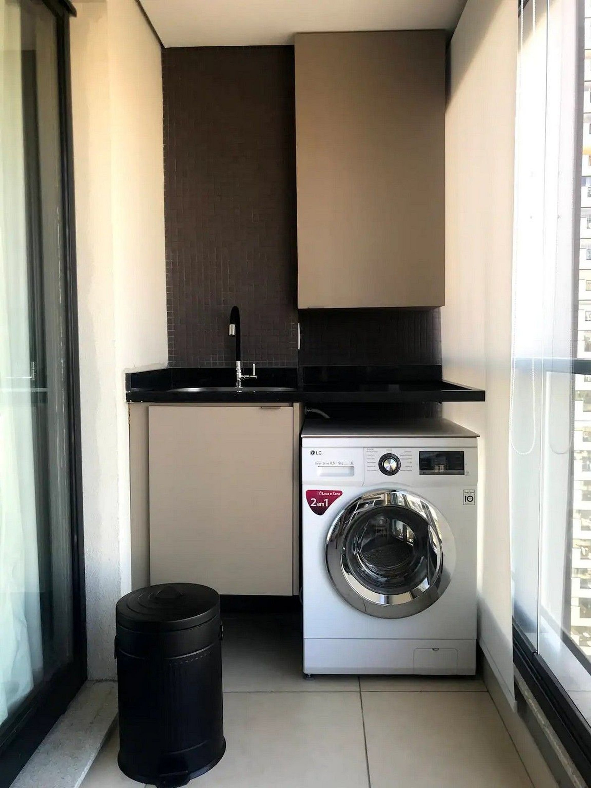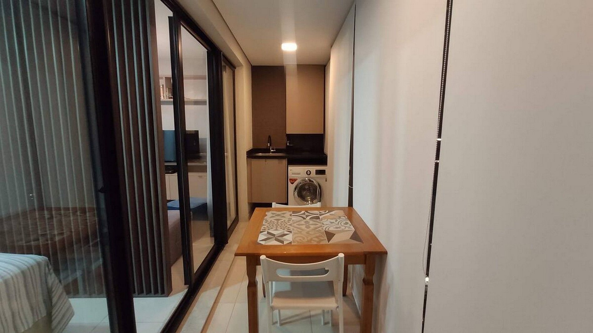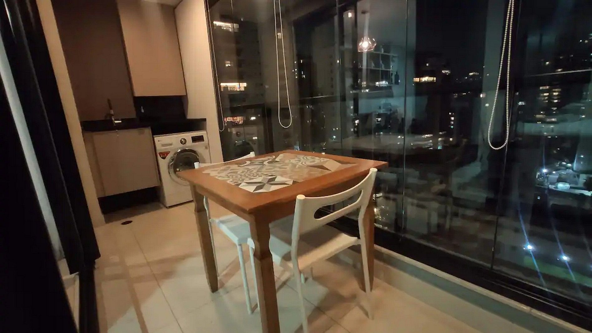 Varanda: Mesa com duas cadeiras e bancos adicionais, máquina de roupas lava e seca e tanque.