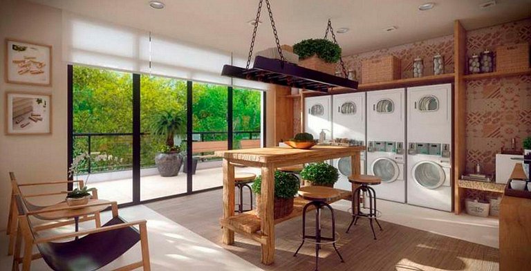 Cozinha: Utensílios completos e novos, cafeteira Nespresso, cafeteira normal, mixer, cooktop de indução com 4 pontos de cocção, forno elétrico embutido, panelas, assadeiras para o preparo de refeições, talheres, xícaras de café, copos, pratos, canecas, bowls.