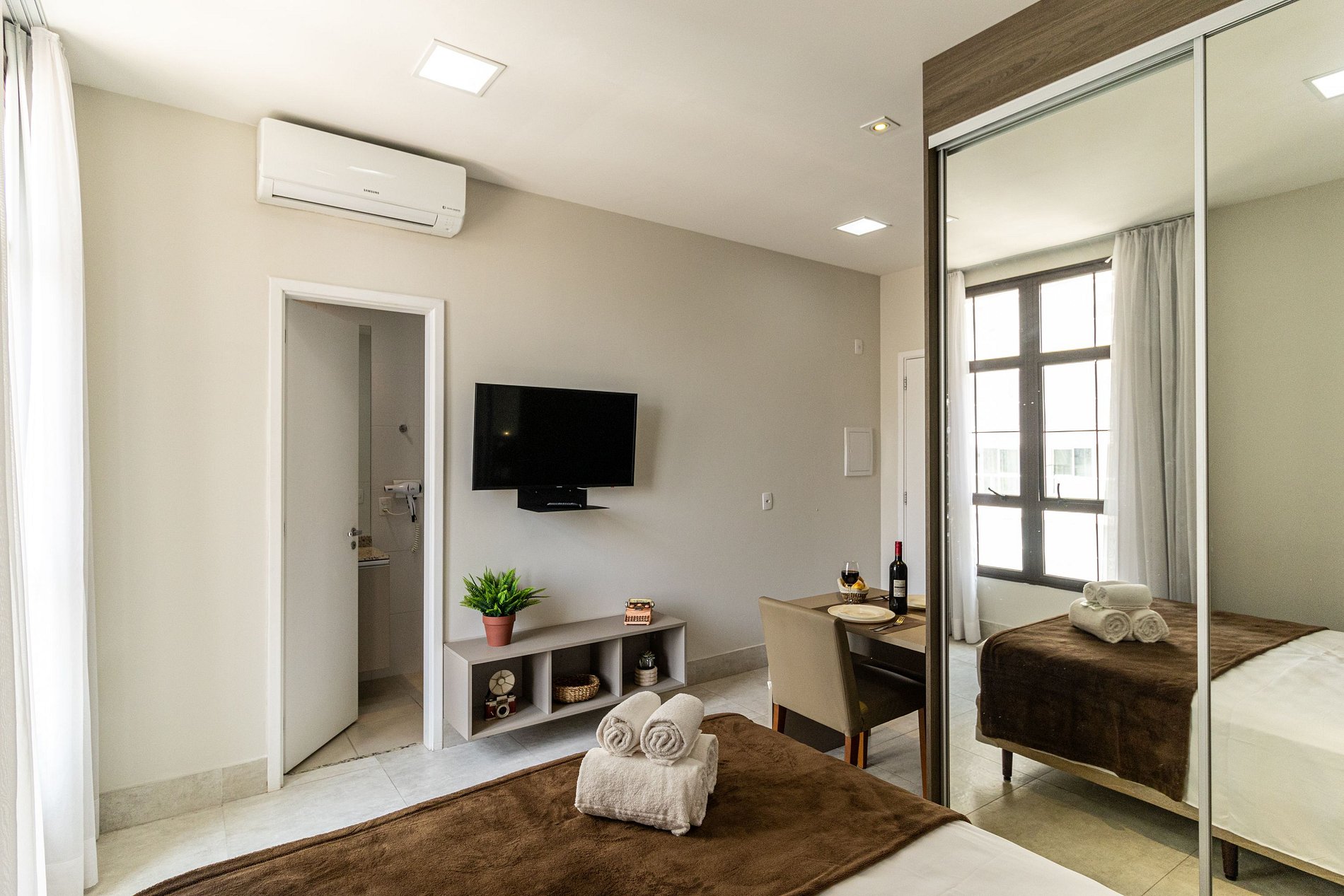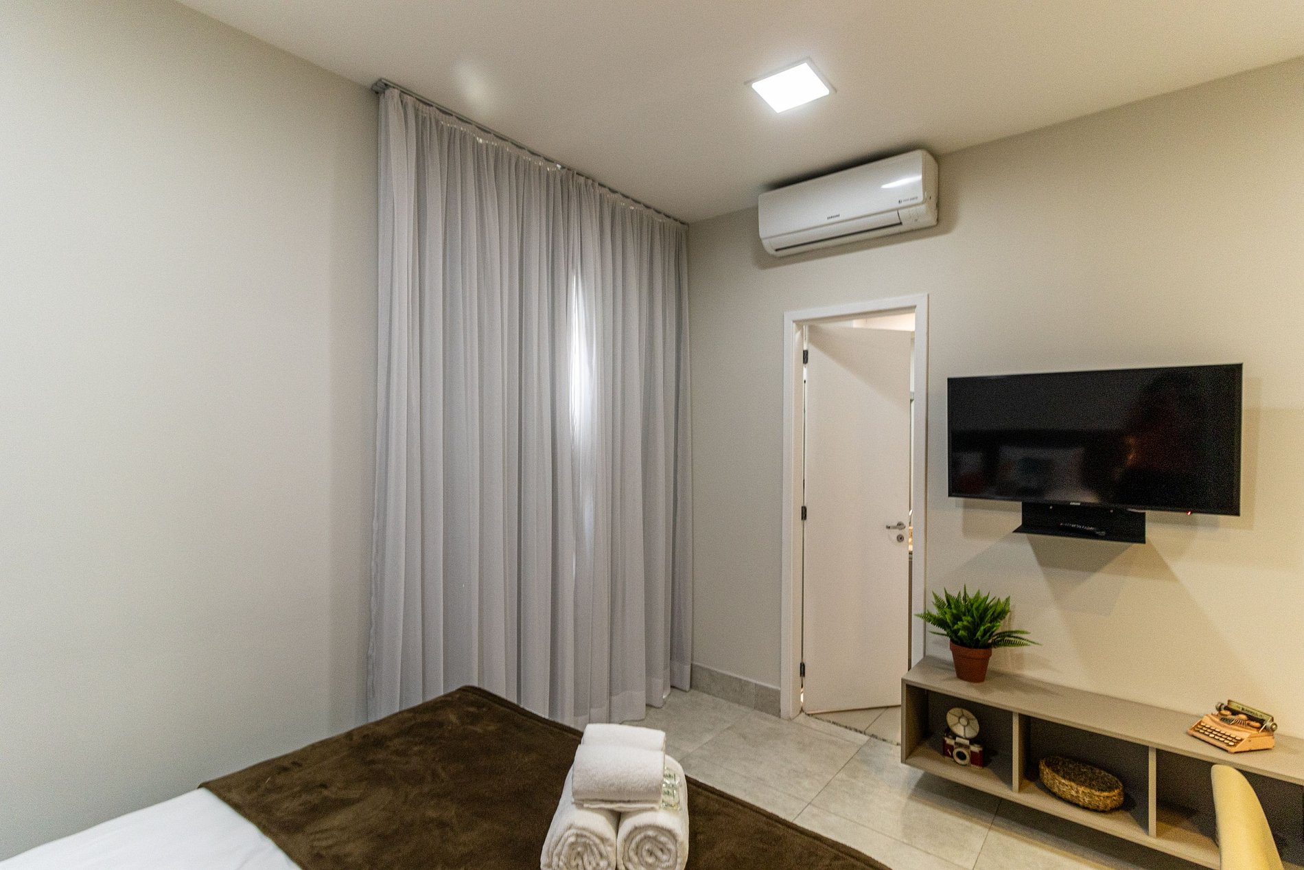O apto tem disponível 2 camas de solteiro, o acesso ao apto é Self check in, só apresentar o documento pessoal na portaria para que possam confirmar a reserva, e posteriormente será entregue o cartão do apto para liberar a fechadura da porta. A recepção é com segurança 24 horas. Ideal para curta e longa temporada.